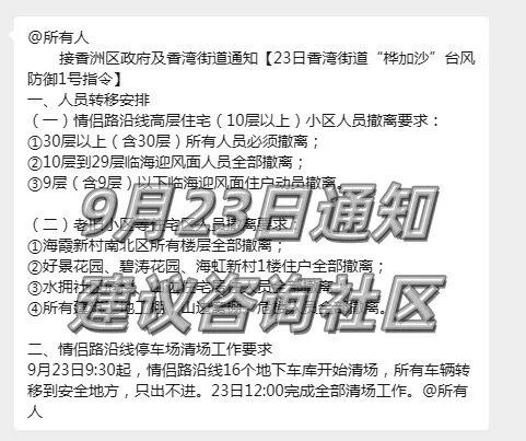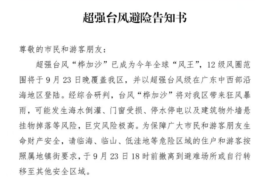另外,根据珠海市香洲区防汛防旱防风指挥部办公室发布的告知书,请临海、临山、低洼地等危险区域的住户和游客按照属地镇街要求,于9月23日18时前撤离到避难场所或自行转移至其他安全区域。