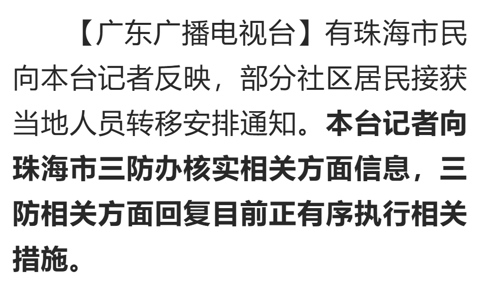 珠海市三防办回应媒体,确认该消息的准确,并表示“三防相关方面回复目前正有序执行相关措施。”