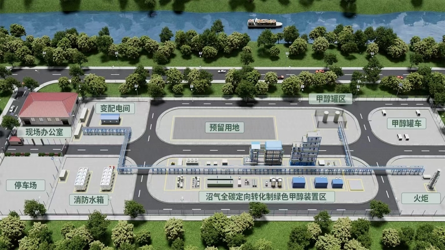 申能集团展示的上海10万吨级绿色甲醇项目,采用生物质甲醇路线,以上海市城市湿垃圾、畜禽粪污等发酵、提纯产生的绿色生物天然气为原料,引入上海化工区3台风力发电机组产生的绿电,通过物料平衡法规模化生产绿色甲醇。