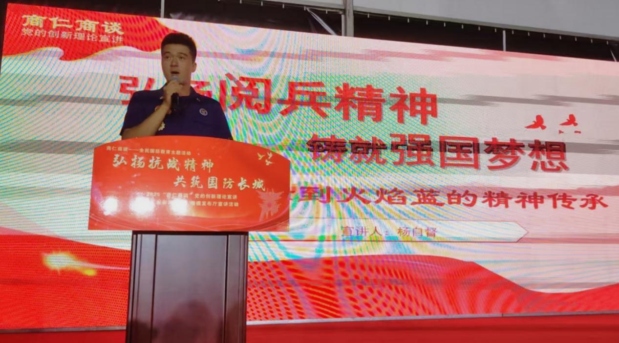 来自商丘市消防救援支队华商大道特勤站消防员杨自督,以预备役部队方队一员的身份参加纪念中国人民抗日战争暨世界反法西斯战争胜利80周年阅兵式,走过天安门广场,光荣接受检阅。他在宣讲中带来了从“橄榄绿”到“火焰蓝”的精神传承故事。讲述了在天安门国旗护卫队的严苛训练,以及参加阅兵式时,顶高温、克服膝盖旧伤,坚持训练六个月、最终正步走过天安门的难忘经历;同时讲述了加入消防救援队伍后,参与70多次灭火救援任务,苦练救援技能的点点滴滴,展现了新时代青年在不同岗位上守护人民、服务人民的初心。