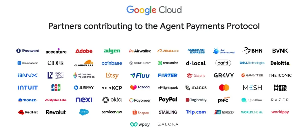 AP2协议的另一核心特征是推动跨平台互操作性,从支持该协议的机构名单来看,既有银联国际、Mastercard、Visa、JCB、美国运通、PayPal等卡组和支付企业,也包括阿里巴巴、Shopee、Lazada、蚂蚁国际、Salesforce、Adobe、Cloudflare等电商平台和科技公司,还有来自加密产业Coinbase、Metamask、以太坊基金会等角色。众多角色的加入,或也说明AgentPayments的前景。