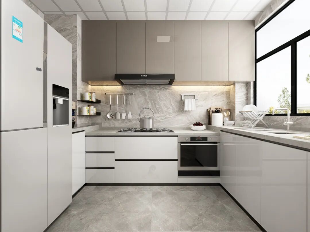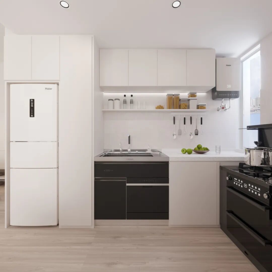 👉解决方案:对于小厨房,优先选择轻薄的冰箱,并在定制橱柜时提前确定好冰箱型号和尺寸,将其嵌入柜体,能实现视觉上的平整统一。