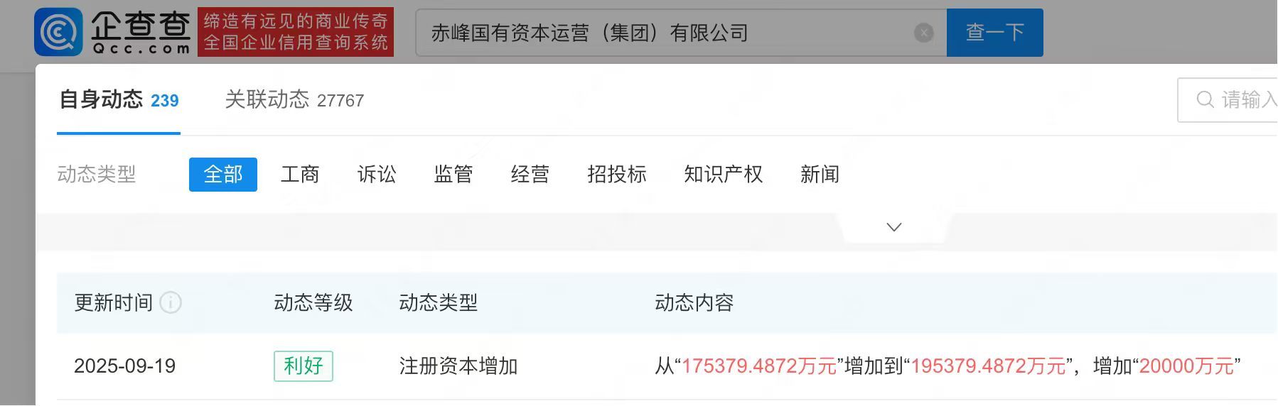 企查查APP显示,近日,赤峰国有资本运营(集团)有限公司发生工商变更,注册资本由约17.5亿人民币增至约19.5亿人民币。企查查信息显示,该公司成立于2008年7月,法定代表人为张炳杰,经营范围含以自有资金从事投资活动,以私募基金从事股权投资、投资管理等,由赤峰市政府国有资产监督管理委员会全资持股。