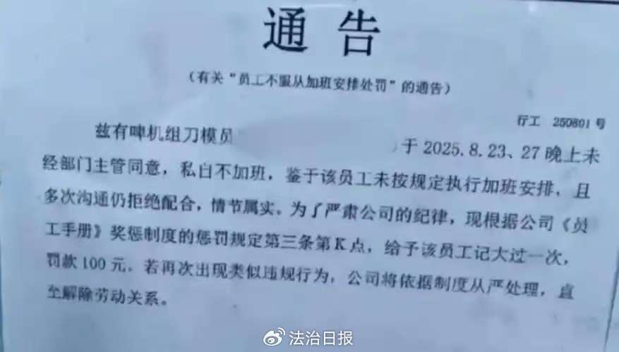 当“不加班”与“罚款”画上等号,不得不令人深思。这听起来匪夷所思的事情,却真实地发生在劳动者的身上。2025年8月28日,广东省东莞市某公司发布了一份通告,针对员工“私自不加班”的行为,给予该员工记大过一次,罚款100元。