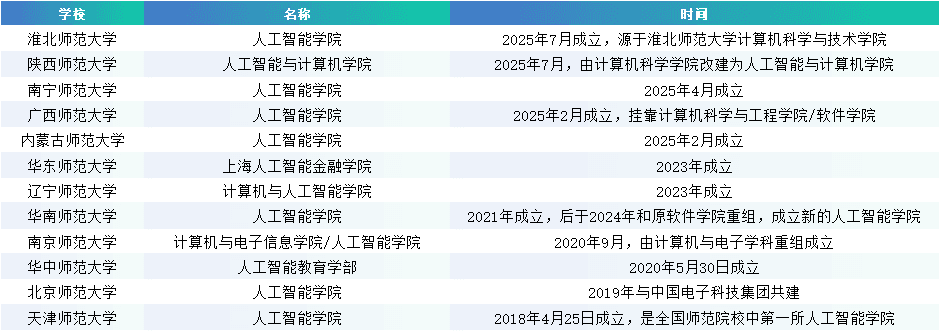 据橡树实验室不完全统计,目前全国已有天津师范大学、北京师范大学、华中师范大学、南京师范大学等12所师范类高校成立人工智能学院。