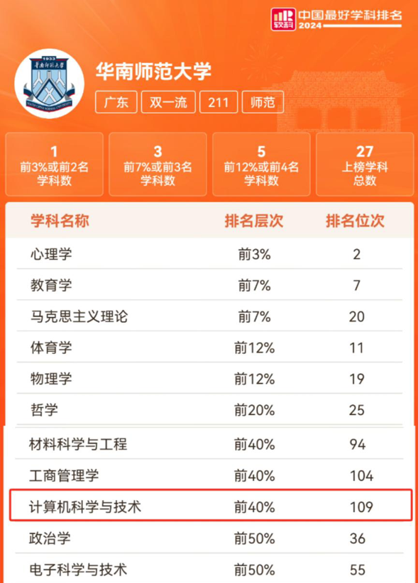 2024软科中国最好学科排名中,华南师范大学共27个一级学科上榜,其中心理学位列全国前3%(全国排名第2名),保持在“中国顶尖学科”行列;教育学、马克思主义理论位列全国前7%,物理学、体育学位列全国前12%,这4个学科均入围“中国一流学科”。