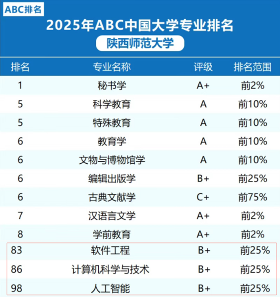 2025年ABC中国大学专业排名显示,学校优势专业集中在秘书学、科学教育、特殊教育、教育学等领域,计算机科学与技术、人工智能专业排名较为靠后。