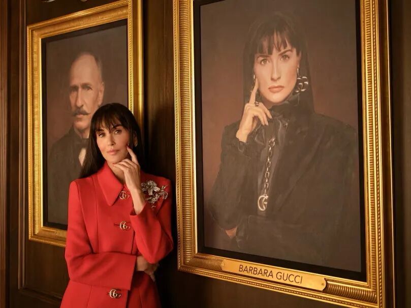 于是,他选择用一部35分钟的电影来呈现自己的首个系列。这部影片灵感来自Ridley Scott 2021年为GUCCI拍摄的家族传记片《House of Gucci》。只是Demna的故事虚构了一个GUCCI家族,Demi Moore在片中饰演一个虚构的女掌门Barbara Gucci,她既是GUCCI集团总裁,又是美国加州州长。