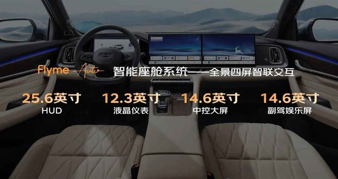 车内用料很厚道,皮质包裹搭配木纹饰板,多媒体中控屏与副驾驶娱乐屏组成的双联屏是整个内饰的亮点,两块屏幕均升级至 14.6 英寸,观感比老款车型好很多。车机加入Flyme Auto系统。基于7nm高通8155芯片的算力加持,而且还提供25.6英寸全彩HUD抬头显示。支持全面屏手势、一语即达等功能,全面兼容Flyme Link、HiCar、CarLink、CarPlay。全系标配深度融合Deepseek大模型的AI语音系统。