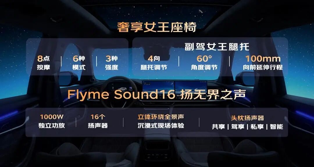 配置方面,新车提供前排座椅加热 / 通风 / 按摩、方向盘加热、以及后排座椅 30-40 度电动调节;车内环境氛围灯以及 Flyme Sound 无界之声 16 扬音响系统等均为全系标配。焕新升级的“奢享女王副驾”,拥有8点座椅按摩,6种模式,3种强度,以及新增4项腿托功能,只需轻触调节,腿托即可向前延伸达100毫米,并支持高达60度的多角度自由调节。