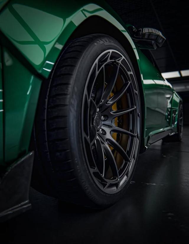 可以看到,该车还升级了锻造轮毂,并且搭配了大六活塞金色制动卡钳,展现高性能的一面。