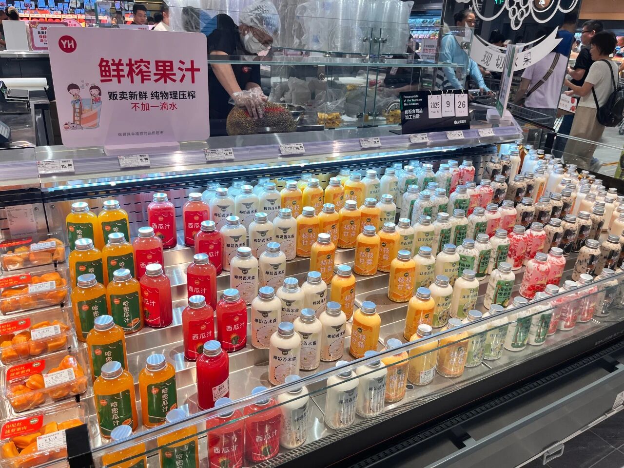 超市内的卤肉食品区(上)与鲜榨果汁区(下)。《消费者报道》记者 摄