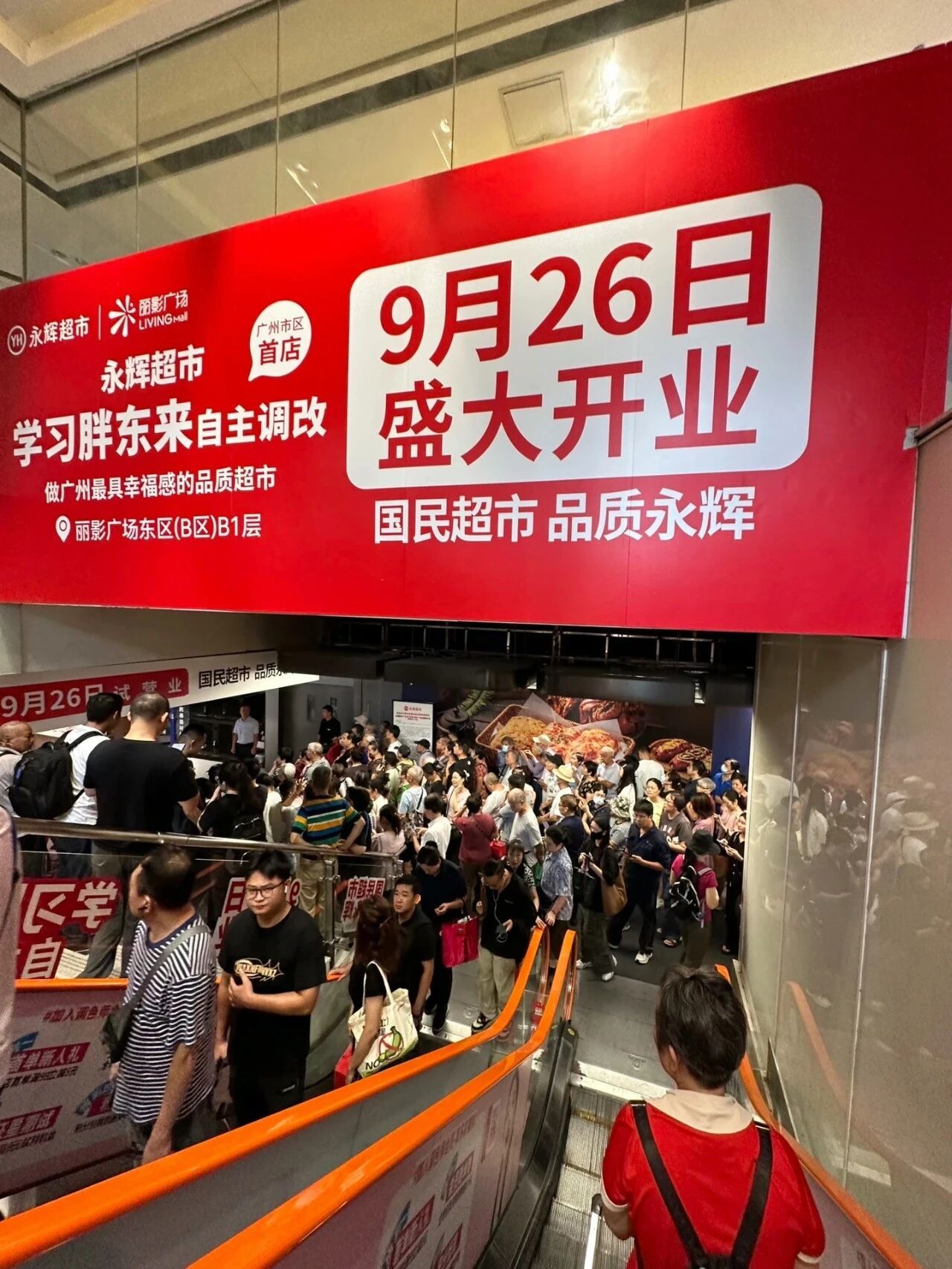9月26日8点56分,广州客村丽影广场,距离广州市区首家胖东来模式调改店——永辉丽影广场店(以下简称“丽影广场店”)试营业还有4分钟,超市两个出入口处就已经大排长龙,全是等待进场的顾客。