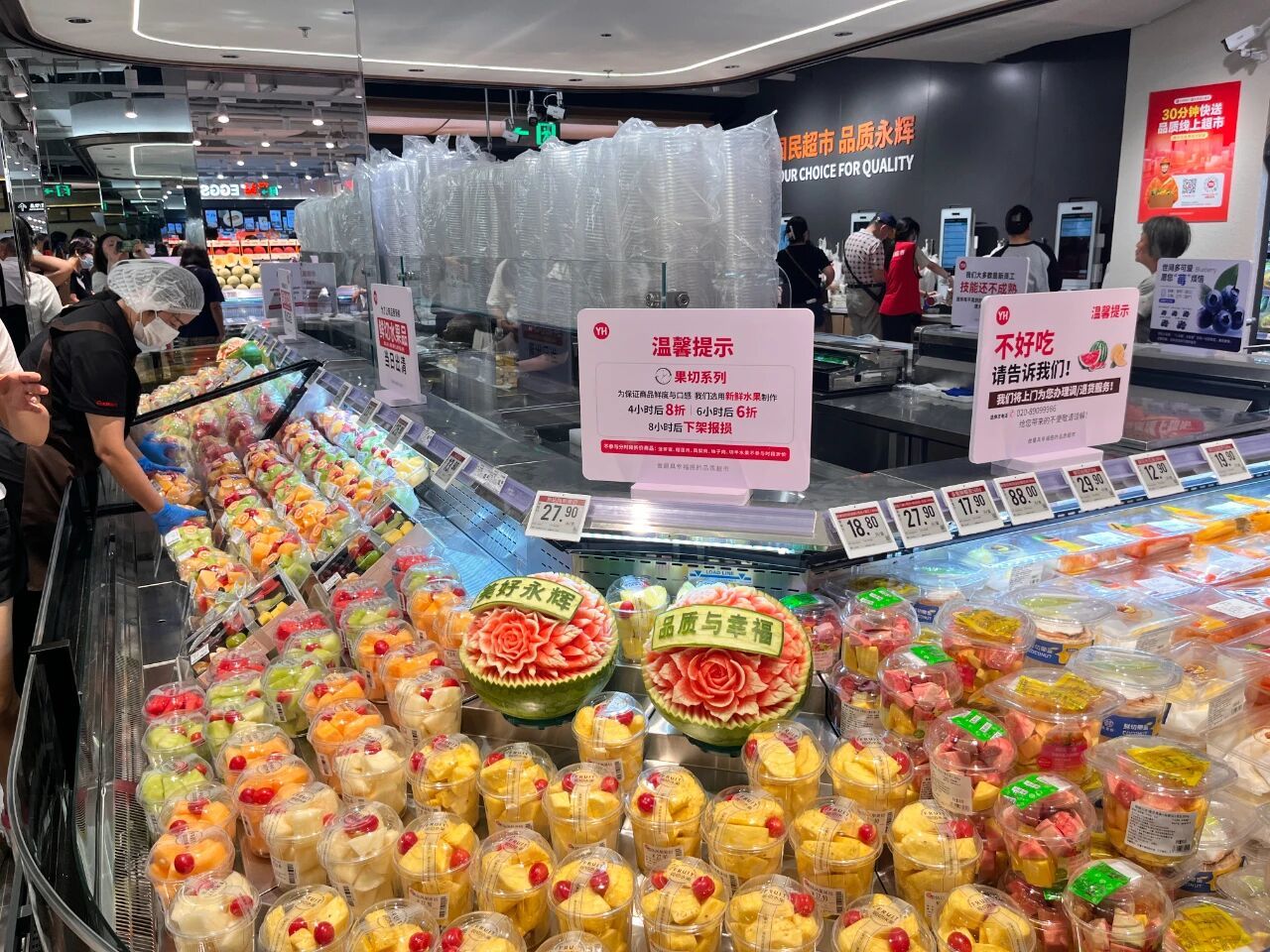 年轻、时尚、健康是门店选品的一大趋势。张热新介绍,调改店的大多数鲜食都有严格的销售时限控制,面包类“当日出清”,新鲜果切严格执行“468”原则,即超四小时八折销售,超六小时六折销售,超八小时直接下架报损,以此规则来保鲜。店长表示,门店对品质要求很高,所有产品都进行包装,“没有散品”。