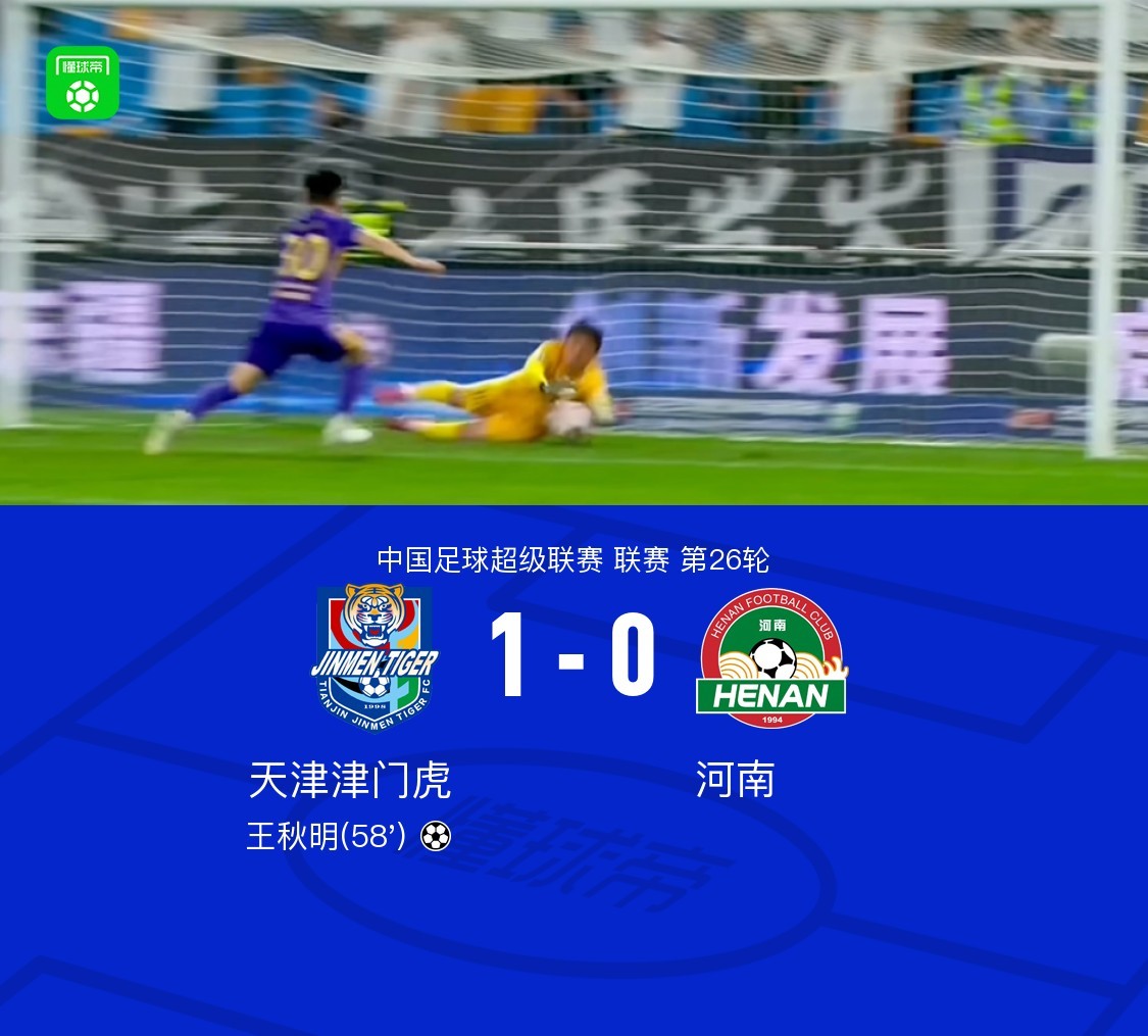 北京时间9月28日,中国足球超级联赛第26轮展开较量,天津津门虎坐镇主场迎战河南。比赛中,王秋明攻入全场唯一进球,帮助球队取得领先。凭借此球,天津津门虎以1-0战胜对手,全取三分。