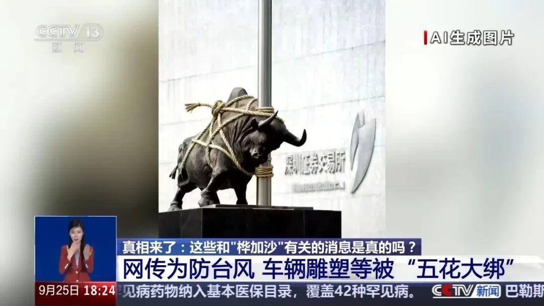 同一天,其他网民传播的图片显示,深交所门前的牛雕塑也被绳子“五花大绑”,拴在柱子上。图片很快在网络发酵,一夜之间,引发大量转发和关注,让关注台风消息的人更加感到恐慌。