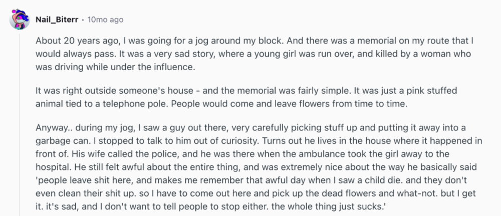 我在搜索“why do people leave roadside memorials”的时候,发现原来美国人自己对这项习俗也早有很多讨论,在reddit上也能搜到很多类似的帖子。除传统以外,大家的原因的确更多是警醒司机“这里曾发生过事故”,要“小心驾驶”。