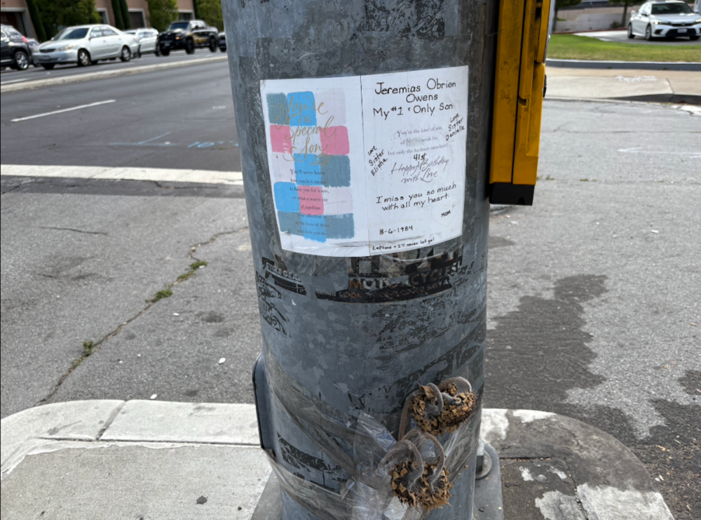 不久前,我难得地在美国坐了一阵公交车,下车回家的路上更是久违地步行穿过平常总是开车路过的十字路口。等待车流通过的间隙,红绿灯柱子手写卡片和花束吸引了我的目光: