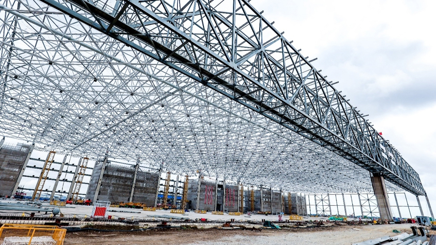 1号机库作为项目核心枢纽,机库大厅跨度达313.5米、进深140.35米,可同时容纳9架宽体机和2架窄体机作业,建成后将成为目前亚洲乃至世界范围内少有的大跨度、大进深宽体机维修专用机库。如此规模的钢网架结构,在设计精度、吊装技术、安全管控等方面均达到行业高难度水平。
