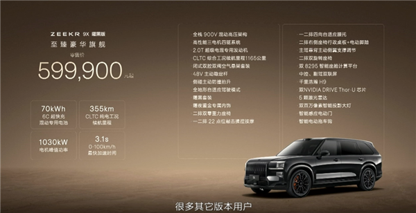 并且,极氪9X全系都是大电池,搭载了全球混动领域容量最高的70度大电池,是全球纯电续航最高的插混产品。