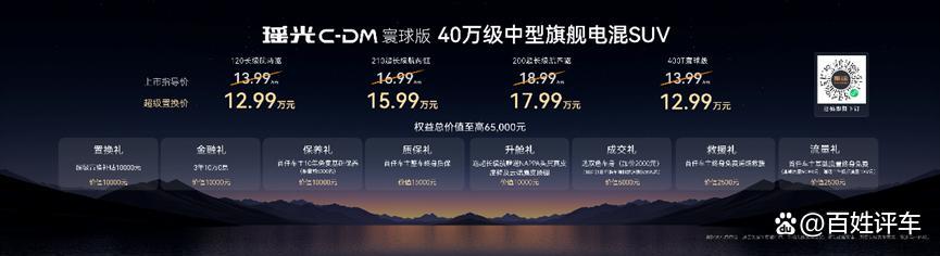本次上市共有瑶光C-DM寰球版120长续航两驱、210超长续航两驱、200超长续航四驱 3款配置版型,指导价分别为13.99万元、16.99万元、18.99万元。新车以40万级豪华品质、40万级豪华安全、40万级豪华性能三大核心优势,重新定义40万级旗舰电混SUV价值标准。同时,星途还为青睐燃油车的消费者提供了燃油版车型瑶光400T寰球版,指导价13.99万元。