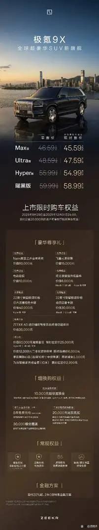 2025年9月29日,极氪旗下全球超豪华SUV新旗舰极氪9X正式上市,共推出Max版、Ultra版、Hyper版、曜黑版四个版型,官方零售价分别为46.59万元起、48.59万元起、55.99万元起、曜黑版59.99万元起,超级置换权益后限时售价分别为45.59万元起、47.59万元起、54.99万元起、58.99万元起。即日起,用户可通过极氪App、极氪官网、极氪小程序、全国各大城市的极氪门店等官方渠道进行预定。