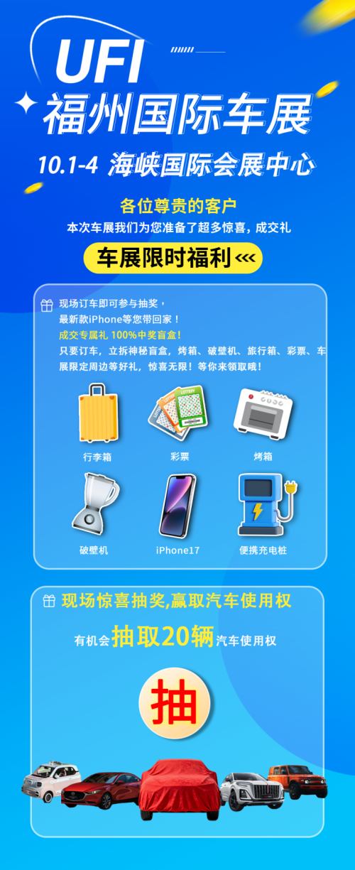 福州十一国际车展,启幕序章,为每一次心动买单,皆有意外之喜相伴,购车即可抽取好礼,100%中奖。
