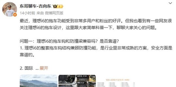 【CNMO科技消息】CNMO注意到,理想i6的拖车功能近期受到非常多用户和粉丝的关注。对此,理想汽车虚拟开发与验证负责人吉向东发布长文进行科普,并回应了拖车钩的安全性问题。