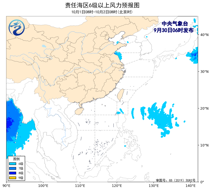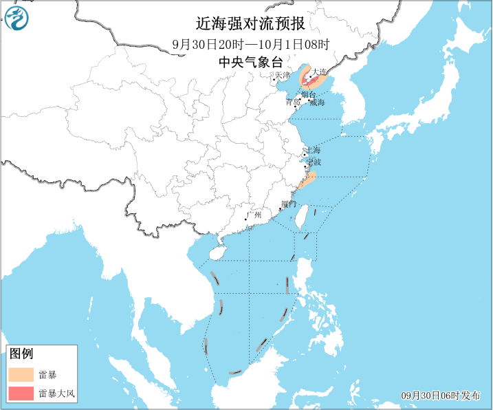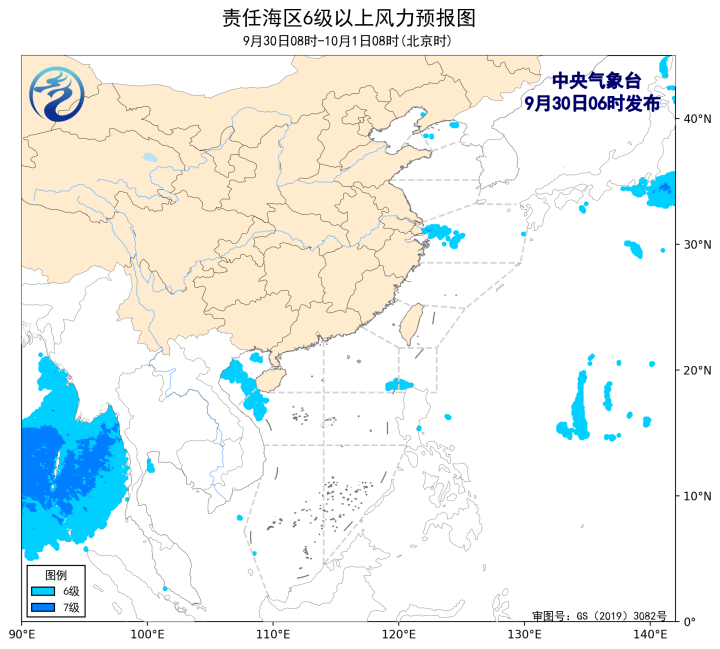 9月30日08时至10月1日08时,北部湾将有4~6级、阵风7级的东南风。30日夜间,辽东半岛沿岸海域将有8~9级雷暴大风。