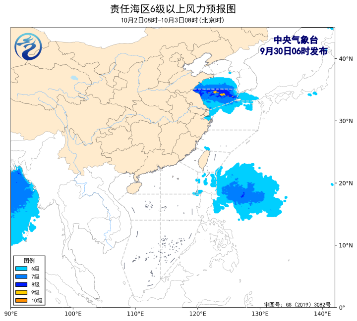 1日08时至2日08时,黄海南部海域将有4级以下增大到5~6级、阵风7级的偏东风。