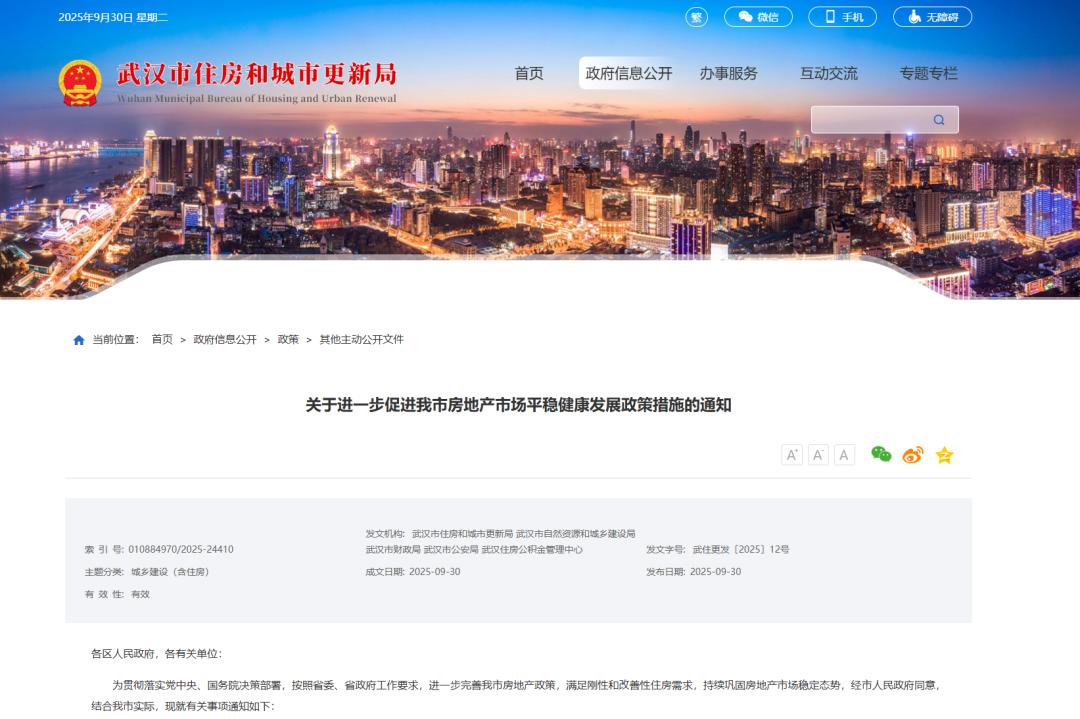 9月30日, 武汉市住房和城市更新局、武汉市自然资源和城乡建设局、武汉市财政、 武汉市公安局、武汉住房公积金管理中心等部门联合发布关于进一步促进武汉市房地产市场平稳健康发展政策措施的通知: