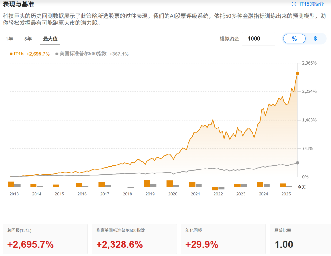 请看下方"科技巨头"策略12年来相对标普500指数的超额收益图表: