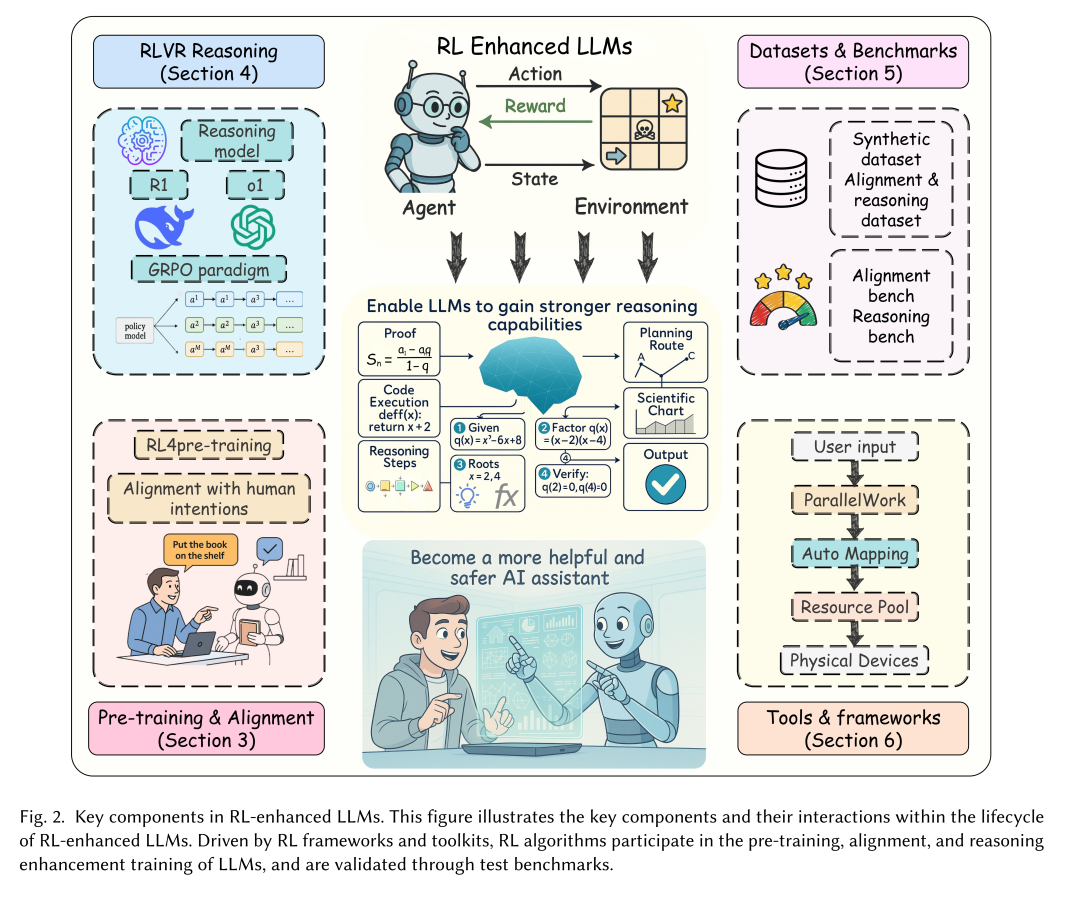 该综述形成了一份基于生命周期的综合分析,既突出了方法层面的进展,也涵盖了配套支持资源,并结合领域技术趋势和工程实践需求分析了现有挑战和未来方向,可作为强化学习增强型大语言模型领域研究者的前沿参考资料,欢迎感兴趣的读者阅读、讨论和引用该论文: