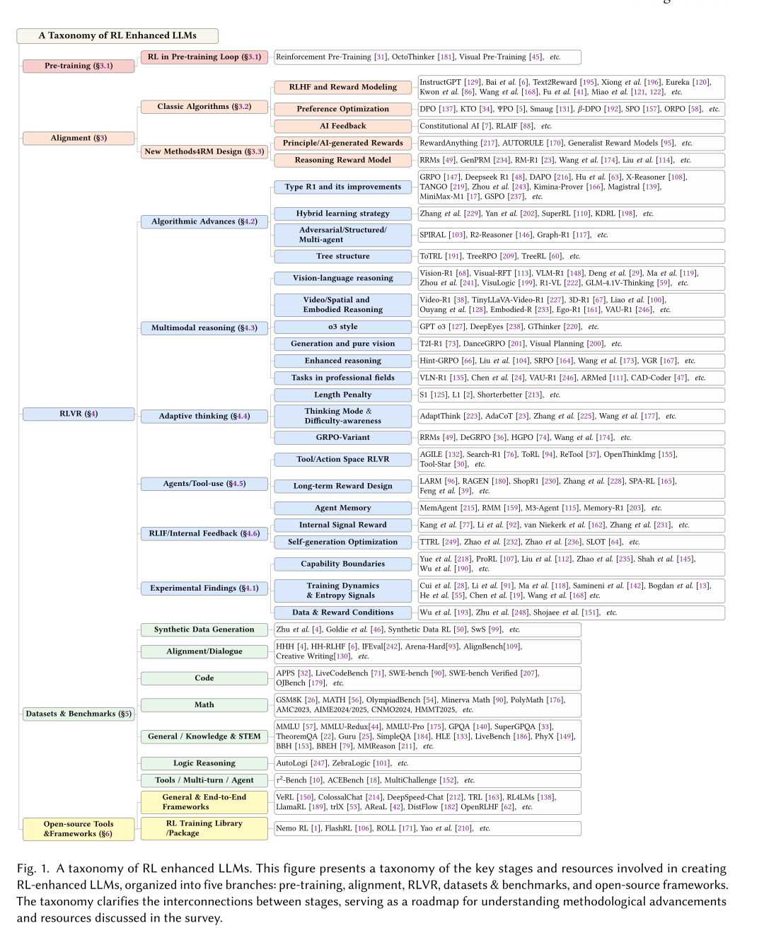 图 2:强化学习增强型大语言模型的分类体系总览图。该图呈现了构建强化学习增强型大语言模型所涉及的关键阶段与资源的分类体系,共分为五个分支:预训练、对齐、基于可验证奖励的强化学习、数据集与基准测试、开源框架。此分类体系明确了各阶段之间的关联,可作为理解该综述所探讨的方法进展与相关资源的参考框架。