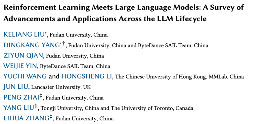 @misc{liu2025reinforcementlearningmeetslarge,title={Reinforcement Learning Meets Large Language Models: A Survey of Advancements and Applications Across the LLM Lifecycle},author={Keliang Liu and Dingkang Yang and Ziyun Qian and Weijie Yin and Yuchi Wang and Hongsheng Li and Jun Liu and Peng Zhai and Yang Liu and Lihua Zhang},year={2025},eprint={2509.16679},archivePrefix={arXiv},primaryClass={cs.CL},url={https://arxiv.org/abs/2509.16679},}