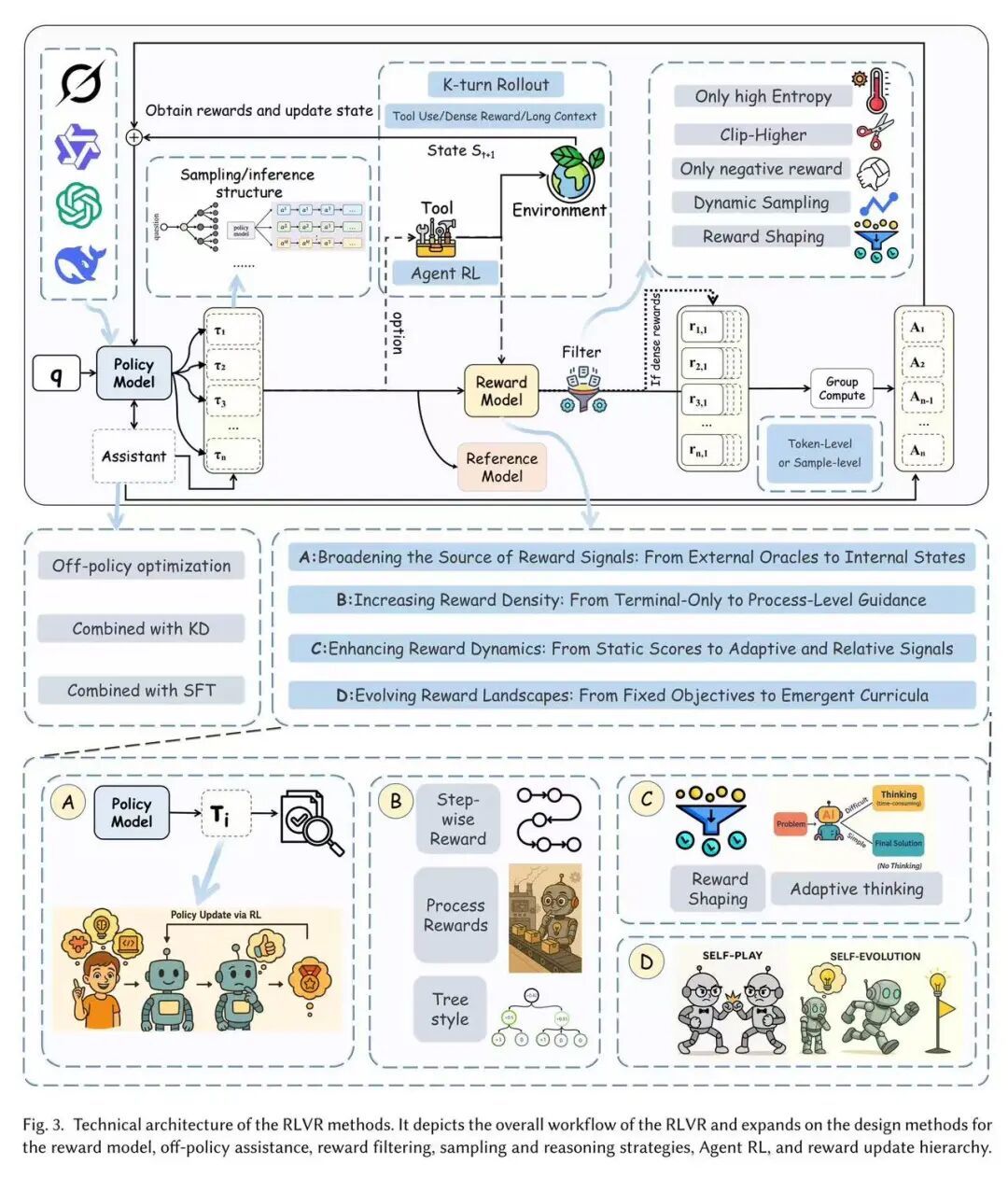 图 3:RLVR 方法的技术架构图。该架构图展示了 RLVR 的整体工作流程,并详细阐述了奖励模型、离线策略辅助、奖励过滤、采样与推理策略、智能体强化学习以及奖励更新层级的设计方法。