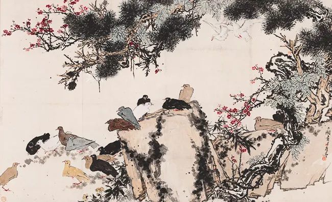 潘天寿 松梅群鸽图 中国画