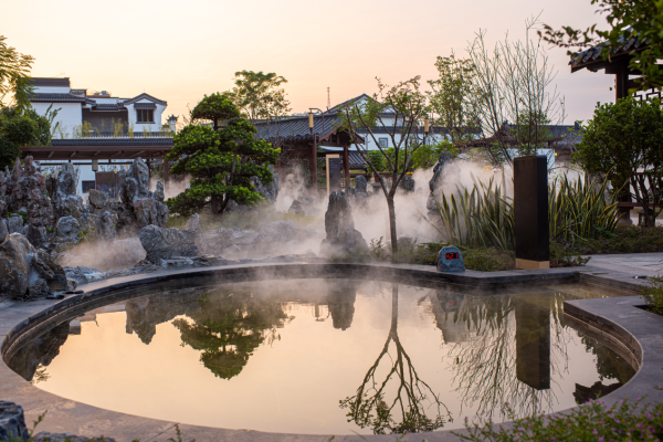 玖崇湖温泉小镇的温泉池中,袅袅热气氤氲升腾,将周遭晕染成一片朦胧又治愈的暖。