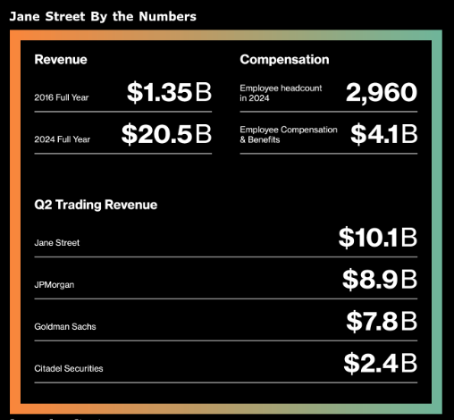 Jane Street的法律纠纷与利润暴涨吸引了全球关注。竞争对手们开始互通情报,试图拼凑出这家打破华尔街银行纪录的公司全貌。Jane Street在第二季度实现了101亿美元的交易收入,今年上半年总收入超过170亿美元,几乎追平2024年创下的全年纪录。