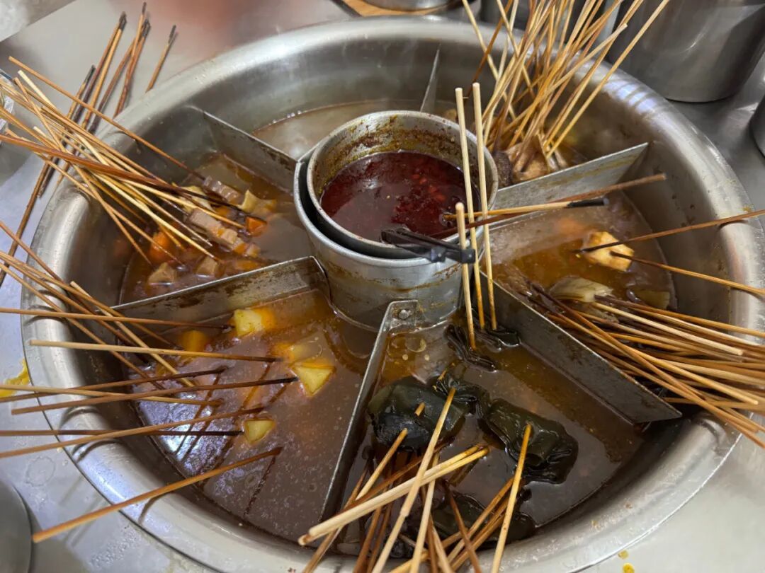 桃江人爱吃麻辣烫,大街小巷遍布各种大大小小的麻辣烫,方桌或者长条桌,中间一口或数口大锅,锅里有汤,如同九宫格的火锅一样分成了若干格,各格里面浸满各种竹签串着的食材,有荤有素,荤的一块素的五毛。食客吃罢结账,得把自己吃净的竹签送与老板,老板数竹签算账,为了区分荤素,荤竹签与素竹签顶端涂有不同颜色的标记,或红或黑或竹签本色红的多少根、黑的多少根、本色多少根,老板一数便知。