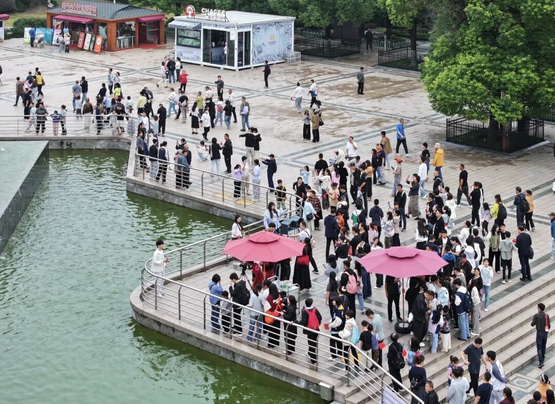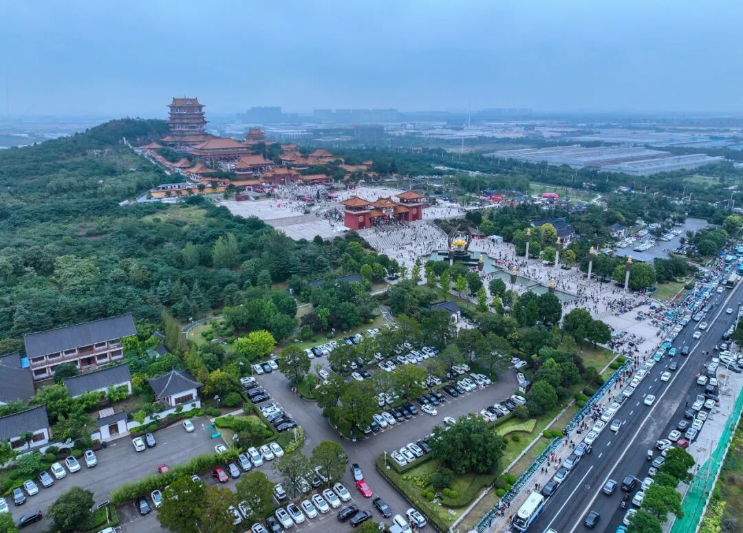 晨钟暮鼓间,蟠桃山景区飞檐翘角与碧清蓝天相映成趣,各地游客在这里品素食、逛市集、赏美景,偶有汉服同好驻足拍照,衣袂随风轻扬,一步一景皆成诗,满是岁月静好的惬意。