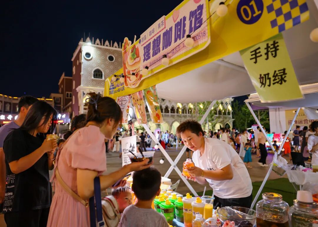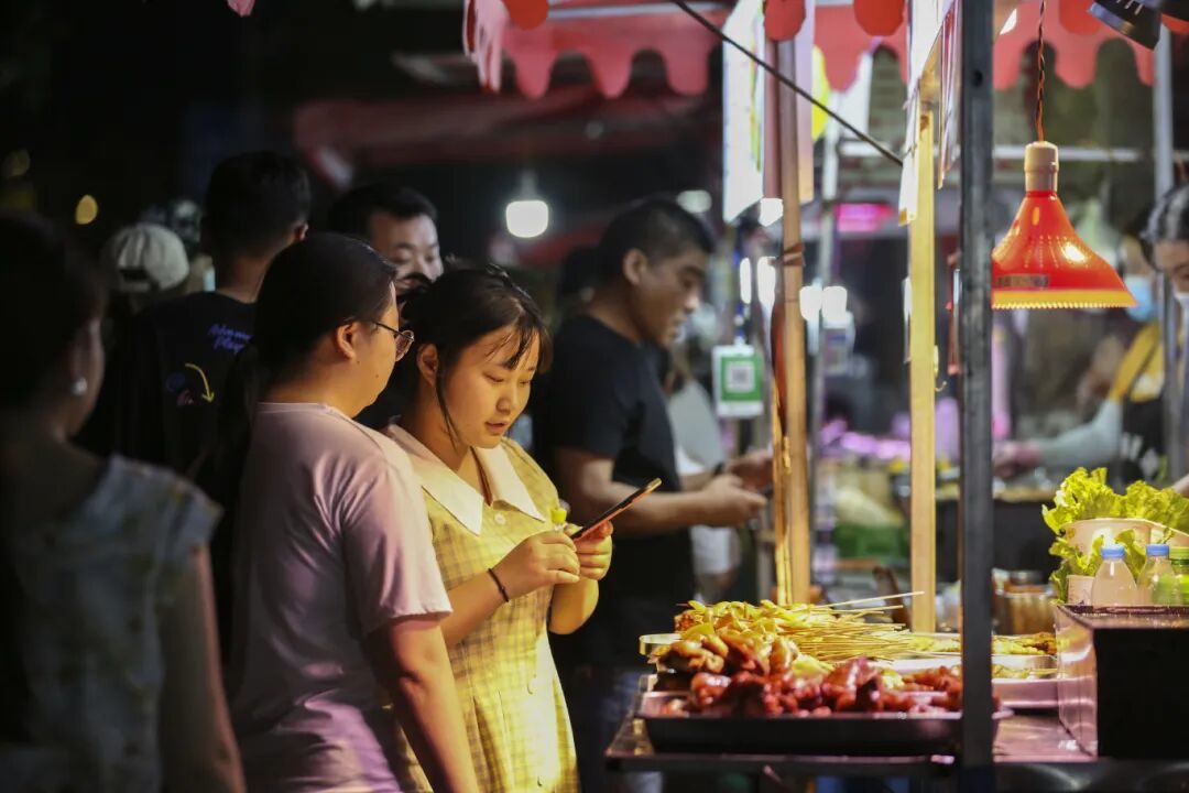 夜幕下的金龙湖夜市满是烟火气,各小吃摊前队伍蜿蜒,烤串香、奶茶甜交织鼻尖。大人领着孩子在文创摊挑手作,年轻人围着游戏区欢笑,叫卖声、音乐声裹着人群的喧闹,摩肩接踵间,连晚风都浸着热闹,深夜依旧人气不减。