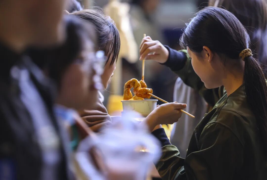 米线、地锅鸡、炸串……在泰隆商业街,店内,炉火旺盛,映红了厨师的繁忙的身影,店外,外地游客拉着行李排队等候品尝,大家边逛边吃、边聊边笑,格外热闹。
