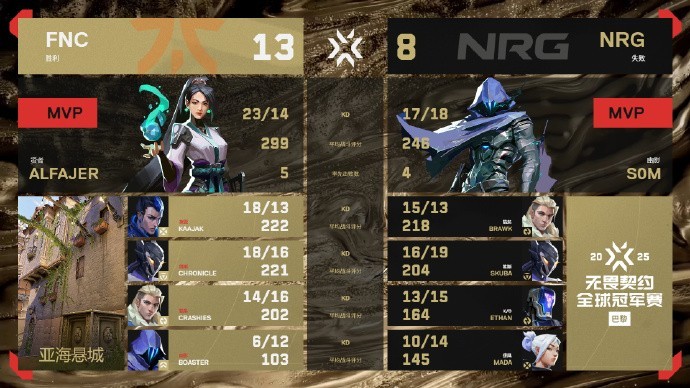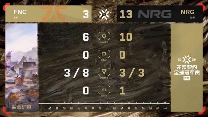 NRG手握地图BP优势,禁用2张图的同时选择盐海矿镇作为图一,在本届冠军赛全胜的他们马上进入状态,全面压制FNC,1-0先发制人;来到FNC选图莲华古城,NRG在进攻方延续手感,多点开花,一度8-1领先并将优势保持到最后,2-0把FNC逼入绝境。