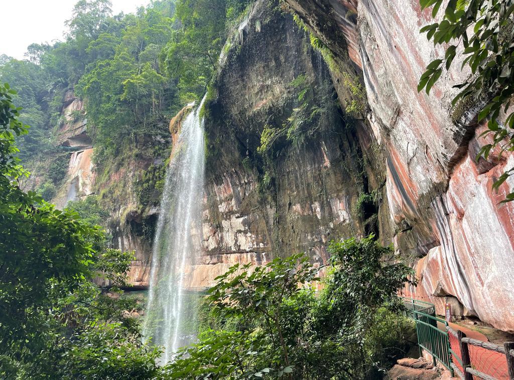 沿着紧贴崖壁的狭窄廊道拾阶而上,人们陆续步入瀑布内侧,体验洞中观瀑的奇景。身处瀑布之后,透过巨大水幕,眼前蒸腾的白色水雾与脚下延伸的赤色岩层交相辉映,岩层表面的纹路如水流般舒展蔓延。