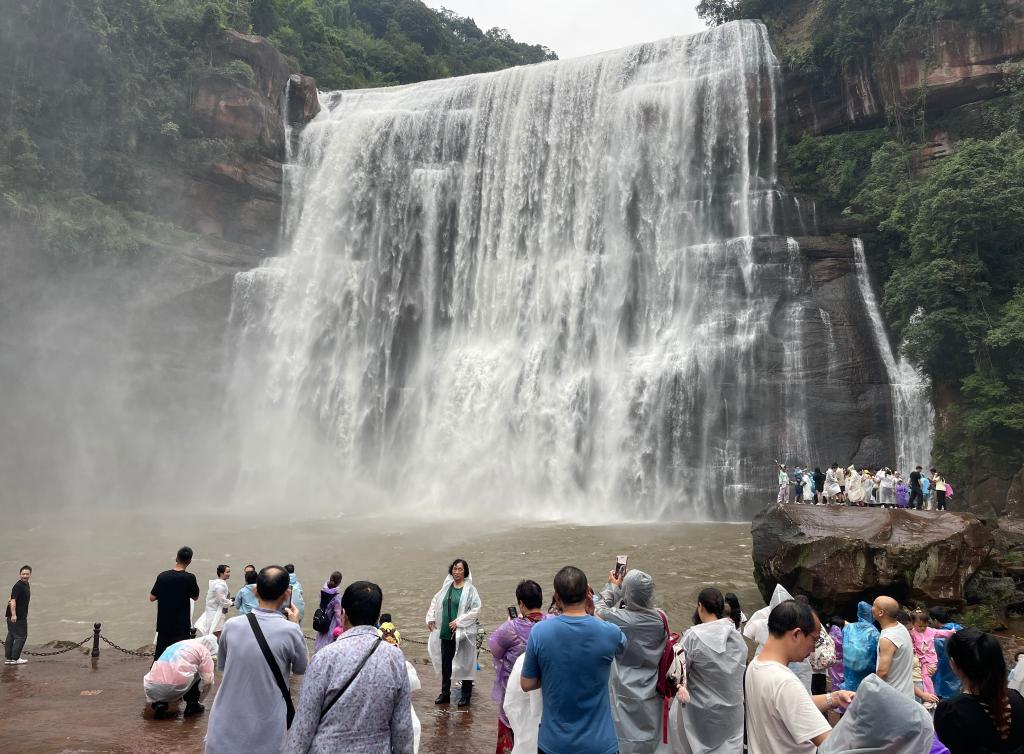 国庆假期,全国各地的游客来到这处贵州赤水境内最大的瀑布。站上观景台,悬崖顶端的水流从丹霞赤壁倾泻而下,水雾经阳光折射出绚烂彩虹,飞溅的水珠落在人们的脸颊,带来山间独有的清凉。