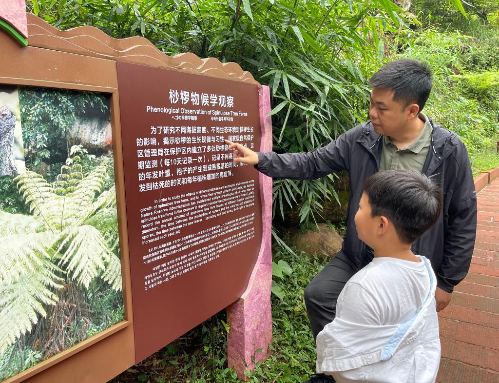 10月4日,游客在赤水丹霞旅游区·燕子岩给孩子讲解“植物活化石”桫椤。新华社记者 骆飞 摄