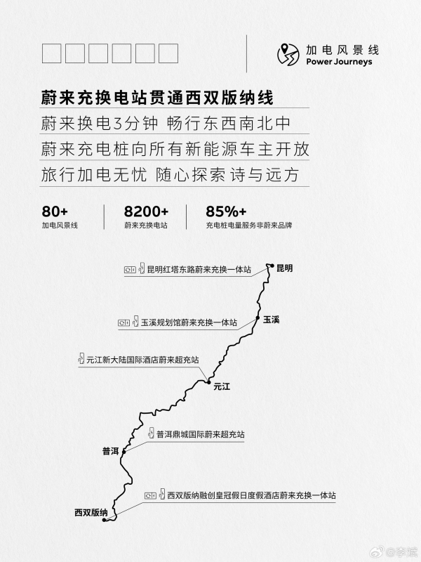为保障用户纯电出行体验,蔚来已于2023年4月20日完成西双版纳主线充换电网络建设。该线路全程约560公里,共布局3座换电站和5座充电站,覆盖景洪、野象谷、中科院西双版纳热带植物园等核心景区,全面支持用户在热带雨林探险或傣族村寨游览时的补能需求。