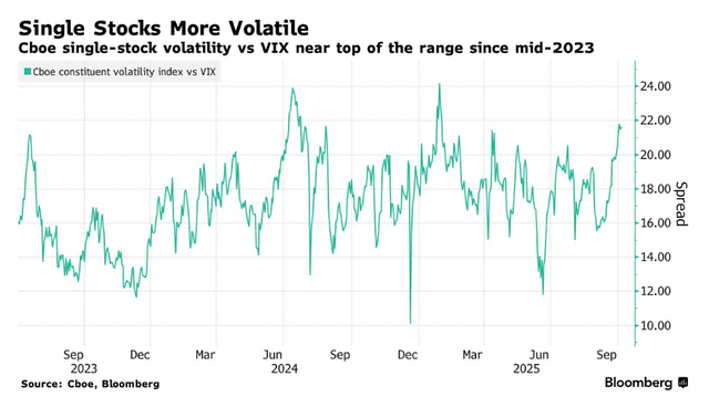 “在标普500指数隐含相关性低、离散度高的背景下,个股波动率与指数波动率的差距已扩大,”彭博情报(Bloomberg Intelligence)首席全球衍生品策略师坦维尔·桑杜(Tanvir Sandhu)在上周的报告中写道。