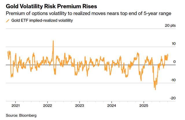 在其他一些市场,实际波动率下降是推升风险溢价的主因,但黄金是个例外。过去一个月,随着金价屡创历史新高,且美国政府停摆为投资者增添了一层不确定性,黄金的隐含波动率持续攀升,推动期权风险溢价升至过去五年区间的高位。
